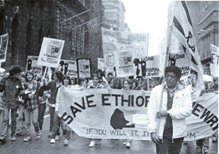 On this website, and its links to Google Photos and FilesAnywhere, you can access original source documents, reports, faxes, articles and photographs, that document the story of Ethiopian Jewish heroes and the Americans who helped them realize their two-thousand-year-old dream to return to Jerusalem and Zion. These records and photos demonstrate the immense efforts of many Beta Israel who sacrified their personal lives to help their community, and the huge output of work by AAEJ activists both in supporting the community and in lobbying the U.S. and Israeli governments to do more. AAEJ American and Beta Israel activists made many trips throughout he U.S. from 1973 to 1991 to plead for the government and the organized Jewish community to take action (see photo on right of Baruch Tegegne marching down Wall Street, NYC). AAEJ political advocacy efforts helped obtain the release of Beta Israel from Sudan and Ethiopia and were instrumental in organizing the airlifts, as well as helping to end the Marxist military regime in Ethiopia in May 1991.